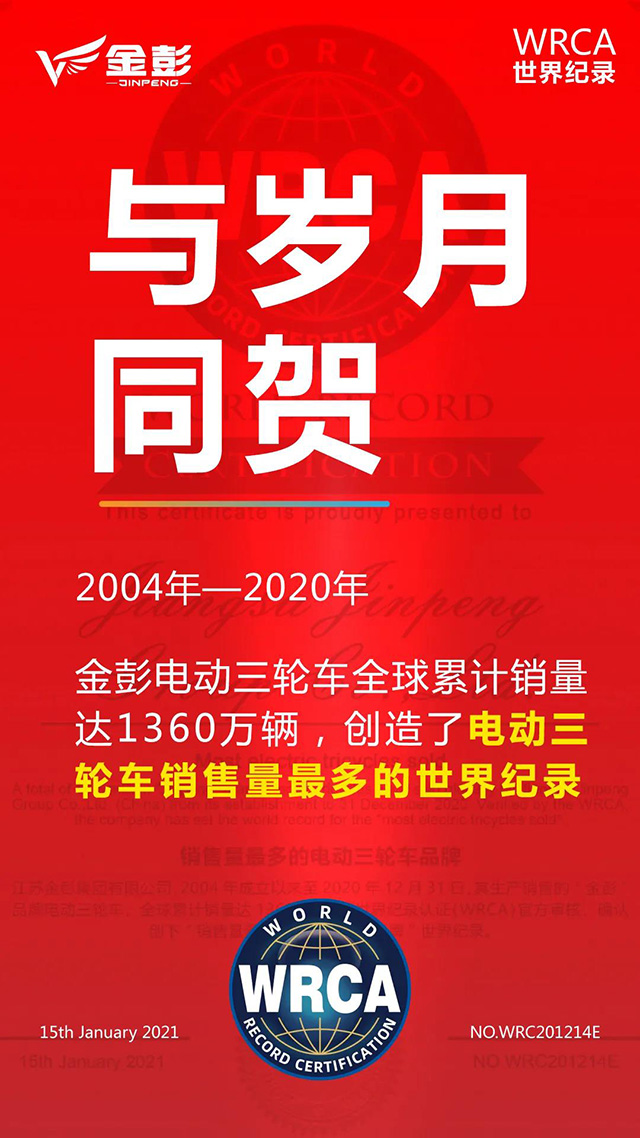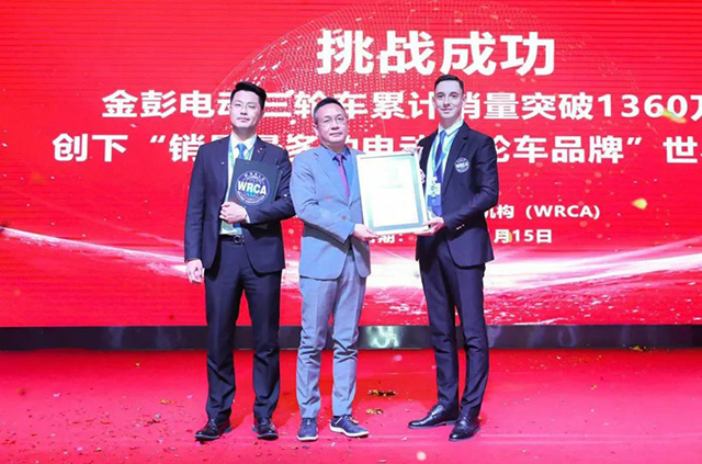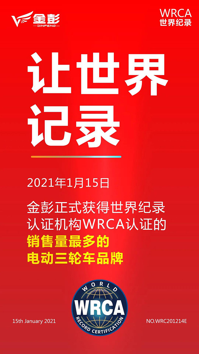 2020年底,金彭以“累計電動三輪車銷量1360萬輛”正式向WRCA申請?zhí)魬?zhàn)“銷售量最多的電動三輪車品牌”世界紀(jì)錄,經(jīng)過WRCA官方的嚴(yán)苛審查和反復(fù)論證,最終認(rèn)定金彭挑戰(zhàn)成功,并將其記入世界紀(jì)錄大全史冊,金彭的“世界之最”終于得到了國際權(quán)威機構(gòu)的認(rèn)可。