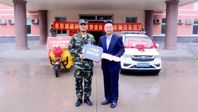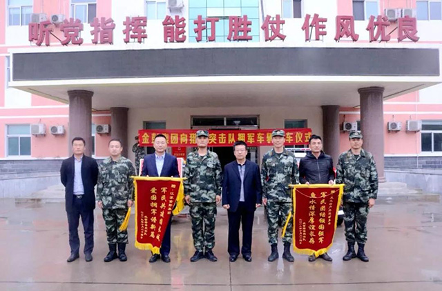 活動最后,金彭集團總裁劉志培向獵鷹突擊隊交接了擁軍車輛,獵鷹突擊隊為江蘇金彭集團授予擁軍錦旗,多方領導共同合影留念。